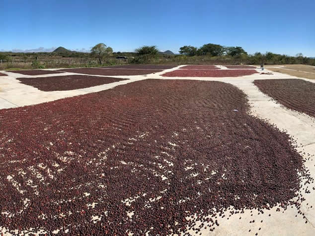3. 發(fā)酵完畢,咖啡櫻桃在40℃環(huán)境下進(jìn)行干燥。櫻桃在考米壇日曬場上干燥,晴朗的白天使得咖啡豆被均勻地干燥,晚上咖啡豆吸取露水重新均衡豆子中水分子分布,第二天進(jìn)一步日曬。周而復(fù)始這個流程10~15天